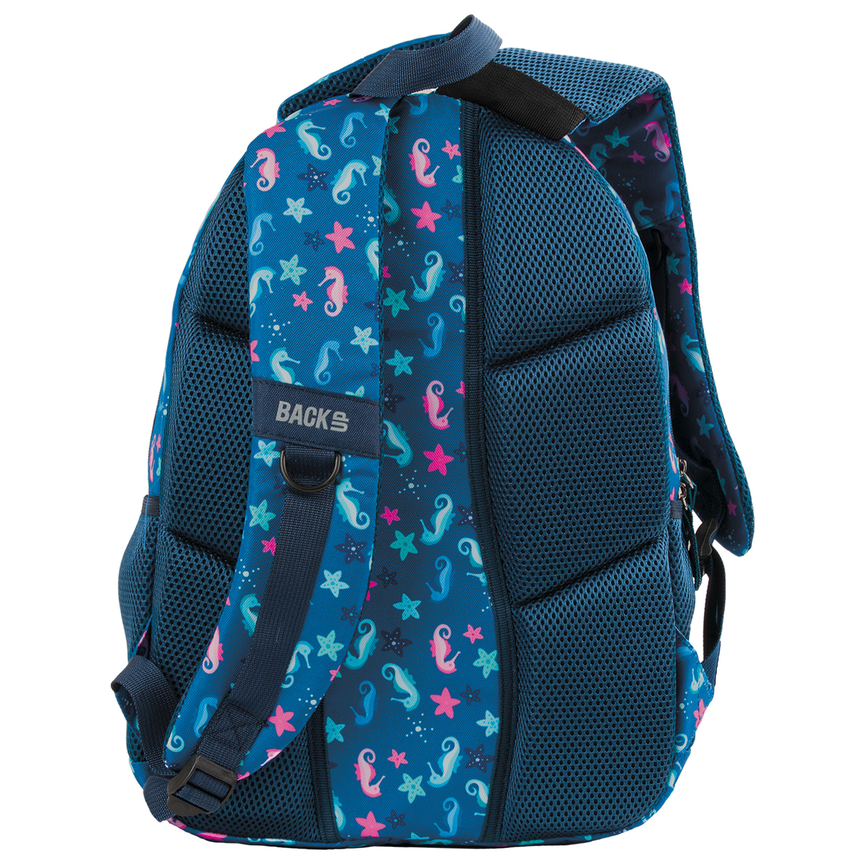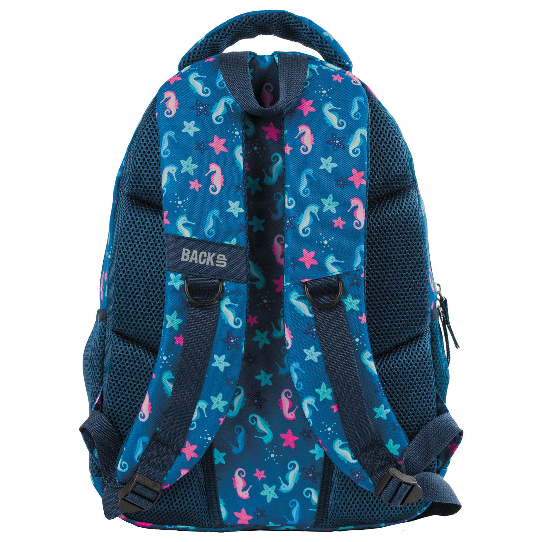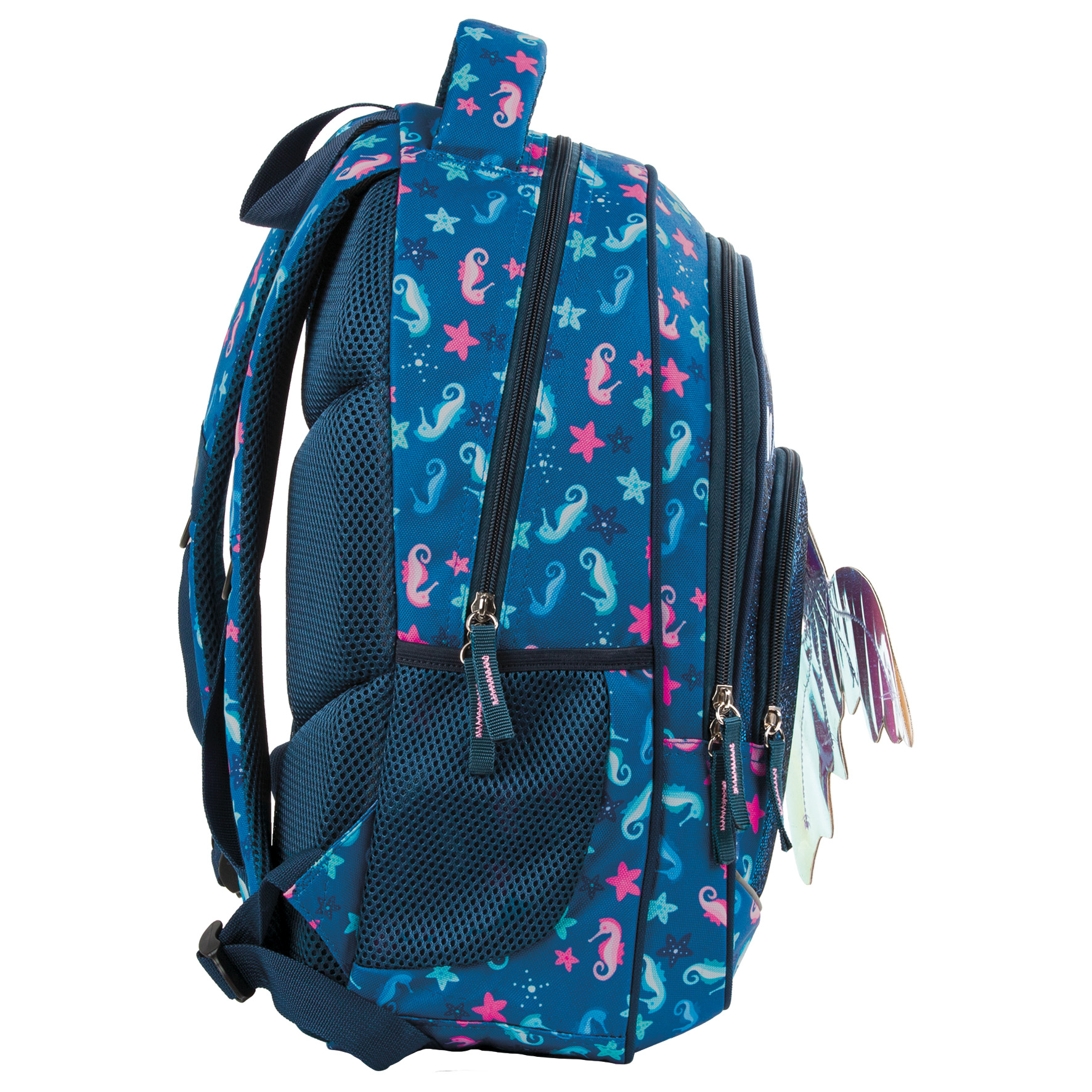 Rozgwiazdy i koniki morskie na niebieskim tle w połączeniu z holograficznym syrenim ogonem 3D sprawiają, że plecak zdecydowanie wyróżnia się w tłumie. Przednia część pokryta jest brokatowym, granatowym materiałem. Nazwa wzoru: glossy navy.